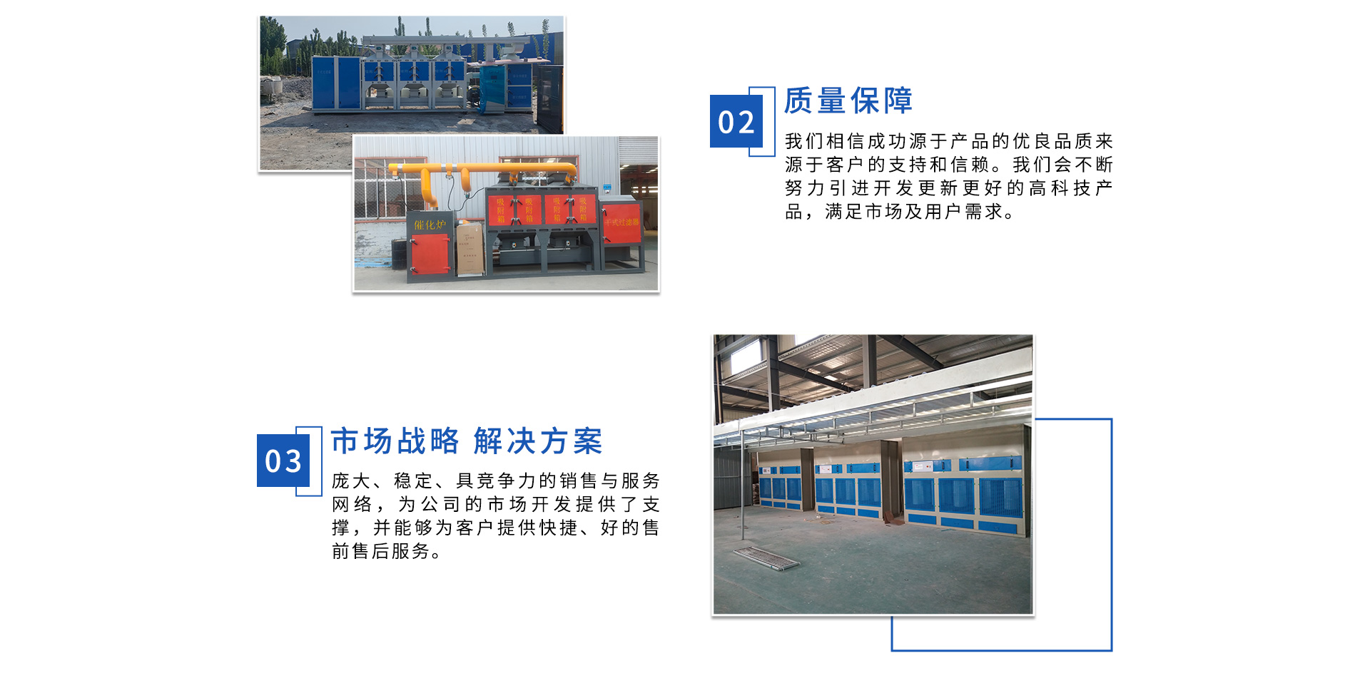 公司自成立以來,始終專注于工業(yè)廢氣、污水、粉塵等環(huán)境污染的治理,先后研發(fā)出催化燃燒設(shè)備、光氧催化廢氣處理設(shè)備、低溫等離子廢氣處理設(shè)備、粉塵處理-體化設(shè)備等一系列環(huán)保設(shè)備,產(chǎn)品先后通過ISO901質(zhì)量管理體系認證、中國環(huán)境保護產(chǎn)品認證。